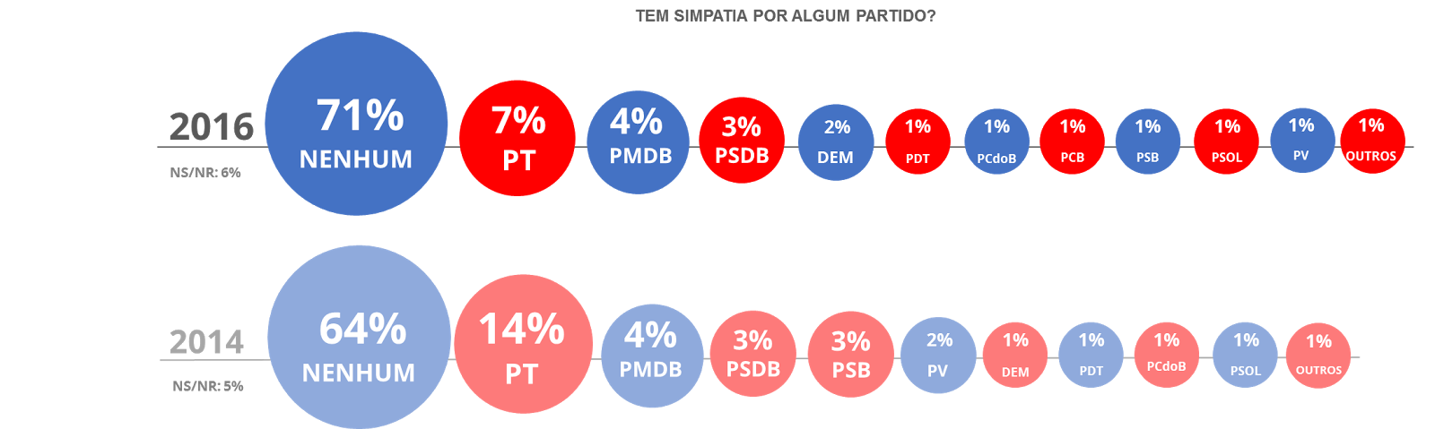 Já os partidos perderam ainda mais simpatizantes. Se em 2014, 64% dos eleitores não se identificavam com nenhuma sigla, agora são 71%. O PT é o partido com maior proporção de simpatizantes em todo Brasil, mas foi o que mais perdeu apoio: foi de 14% para 7% a proporção de eleitores que assumiram espontaneamente ter simpatia pelo partido.