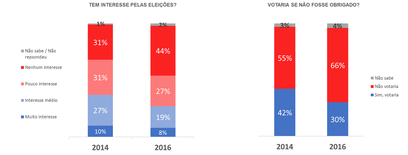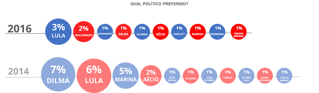 O interesse dos brasileiros pelas eleições municipais deste ano foi muito baixo. Segundo os resultados do estudo Mapa Político 2016, da agência de pesquisa de mercado Hello Research, que entrevistou 1800 brasileiros antes do início das campanhas eleitorais, somente três em cada dez eleitores diziam que estavam interessados no processo ou que votariam mesmo não sendo obrigados. Em 2014, a média era de quatro a cada dez nas duas situações. A preferência pelo presidente Lula também caiu:
