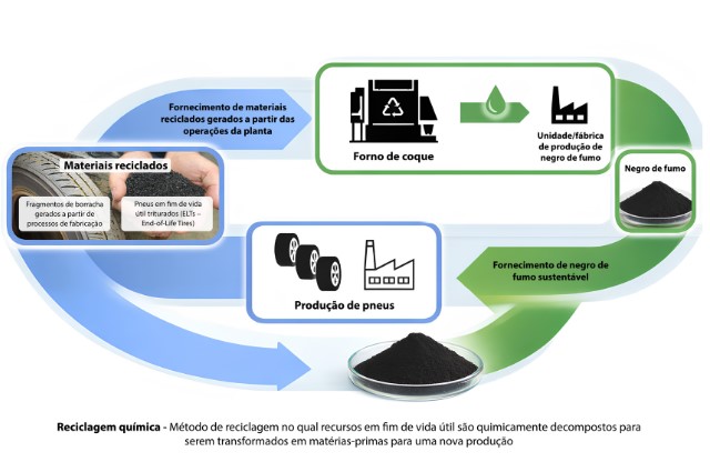 O negro de fumo sustentável é fabricado a partir de aparas de borracha geradas nos processos de produção de pneus e de ELTs triturados, que passam por um processo conhecido como reciclagem química. O desenvolvimento dessa solução vem sendo conduzido em um projeto conjunto com a Mitsubishi Chemical Corporation desde janeiro de 2025.
